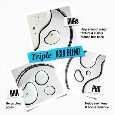 - Exfoliation + Spot Correction: The Triple Acid Peel exfoliates the skin’s surface, promoting cell turnover and helping other products penetrate deeper. It smoothens rough texture, minimizes pores, and lifts away dead skin cells that may dull your complexion. When combined with the Dark Spot Solution, the serum can penetrate more effectively, enhancing its ability to fade dark spots and even out skin tone.